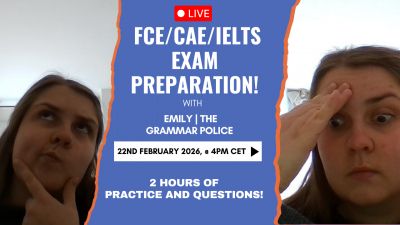 Este fin de semana (febrero 22nd, a las 4pm) se realizará una sesión de 2 horas de preparación de exámenes en YouTube, bajo el nombre de The Grammar Police. En esta sesión veremos:
