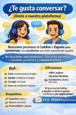Trabajo 100% remoto, horarios flexibles. Pago por hora de acuerdo a tu experiencia Ayuda a otros a mejorar su manejo del español conversacional. No es necesario que seas profesor. Estudiantes adultos mayormente de EEUU