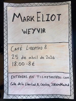 This Saturday 25th at 6pm come to Cafe Libertad 8 in Madrid for a concert featuring British artist from Gibraltar Mark Eliot, and US/Indian artist weyvir. Featuring songs with English and Spanish flavours! https://ticketandroll.com/evento/mark-eliot-y-weyvir-en-libertad-8